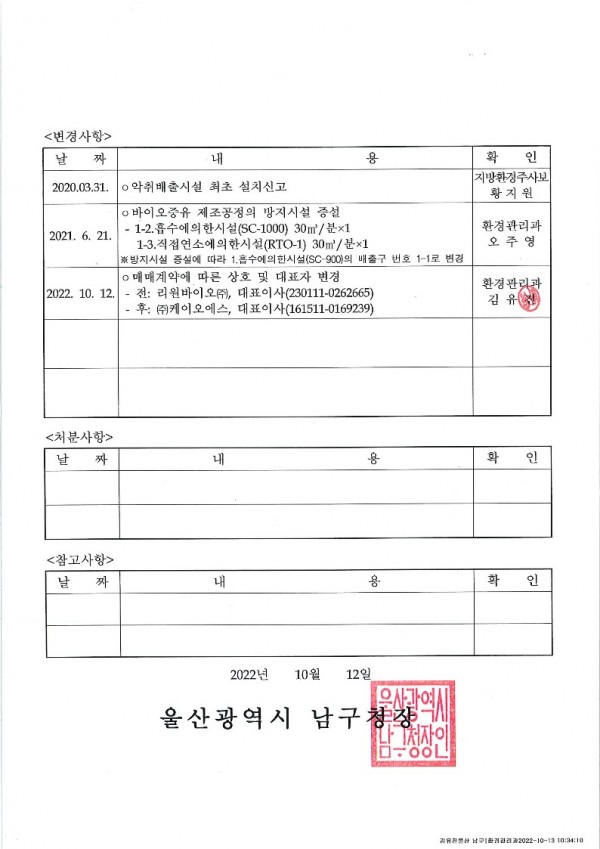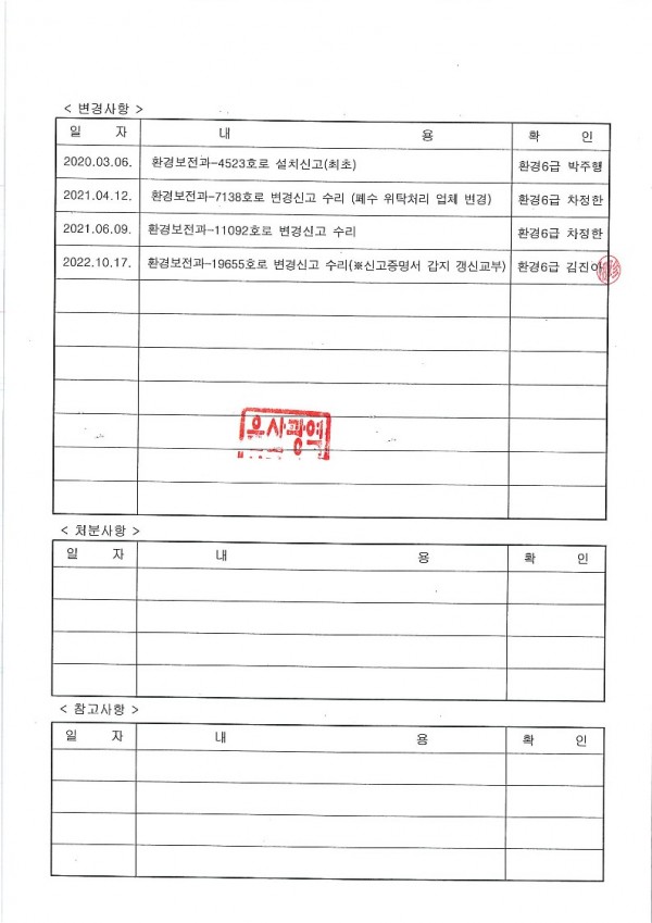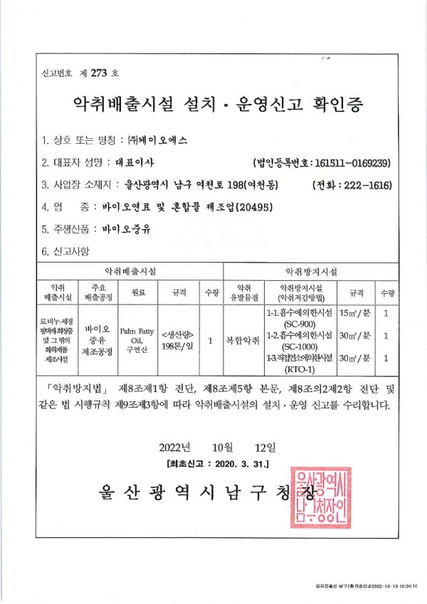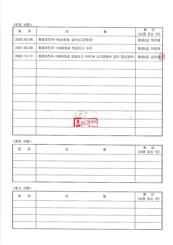 악취배출시설 설치운영 신고 확인증