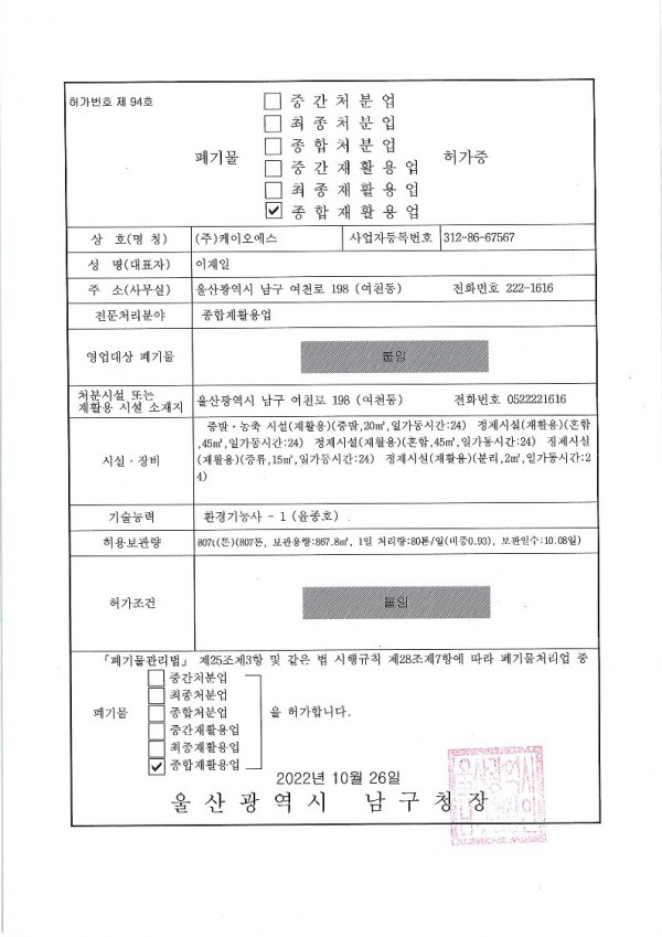 폐기물종합재활용업 허가증