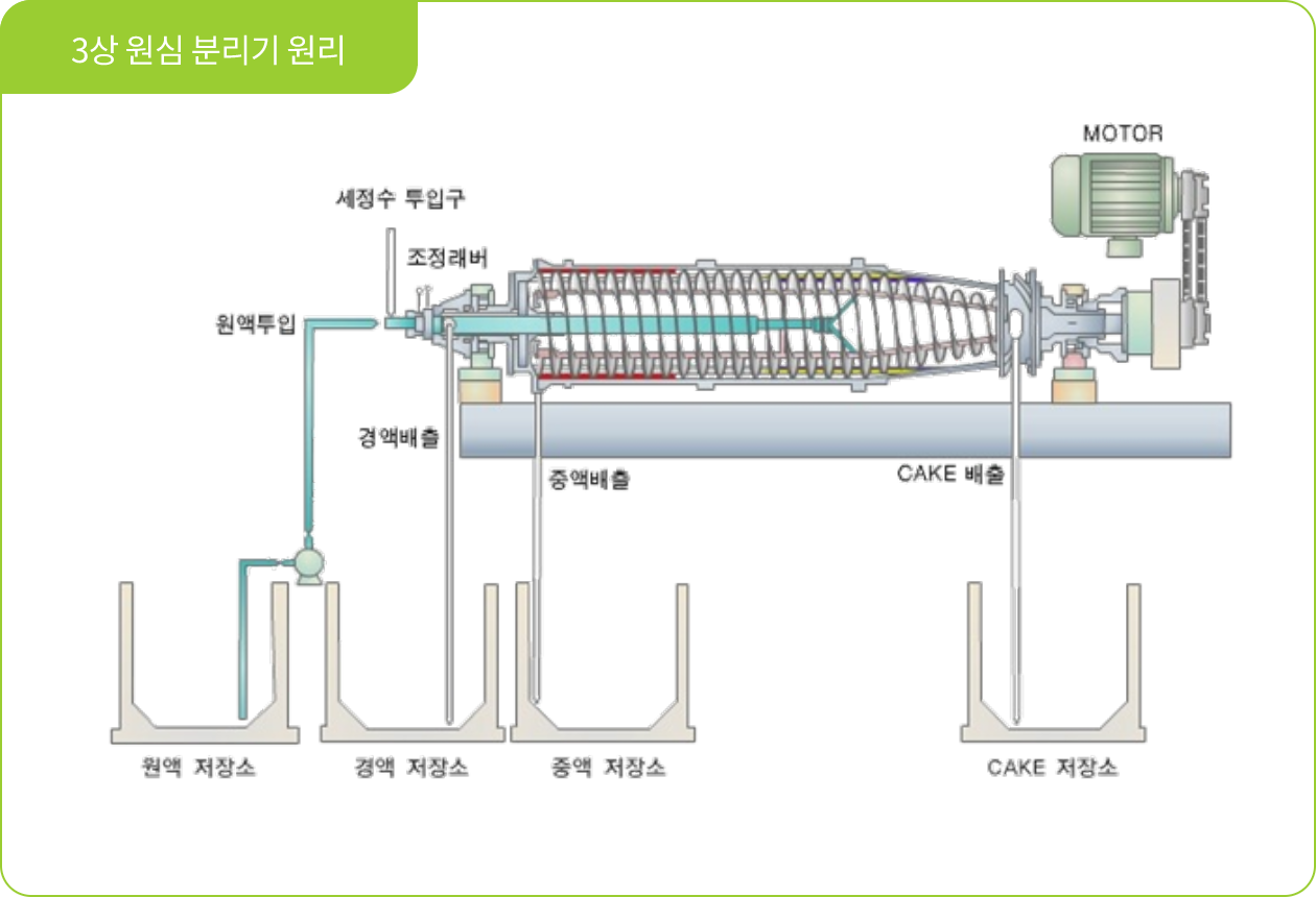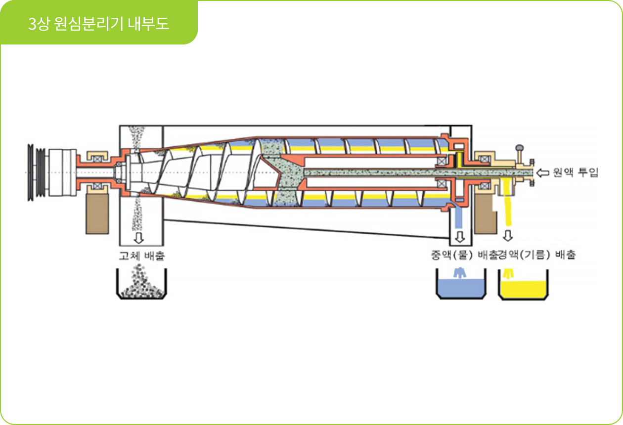 - 3상 원심분리기(시간당 처리용량, 5 ∽ 6 ton)를 통해 슬러지, 음폐수 및 유분으로 분리하여 유분은 히터가 있는 보조저장탱크로 이송됩니다.