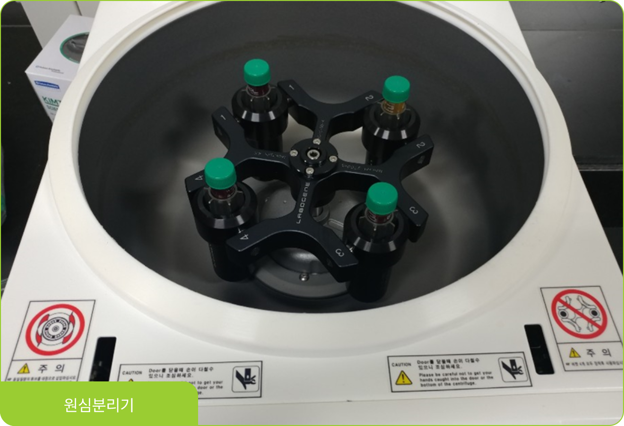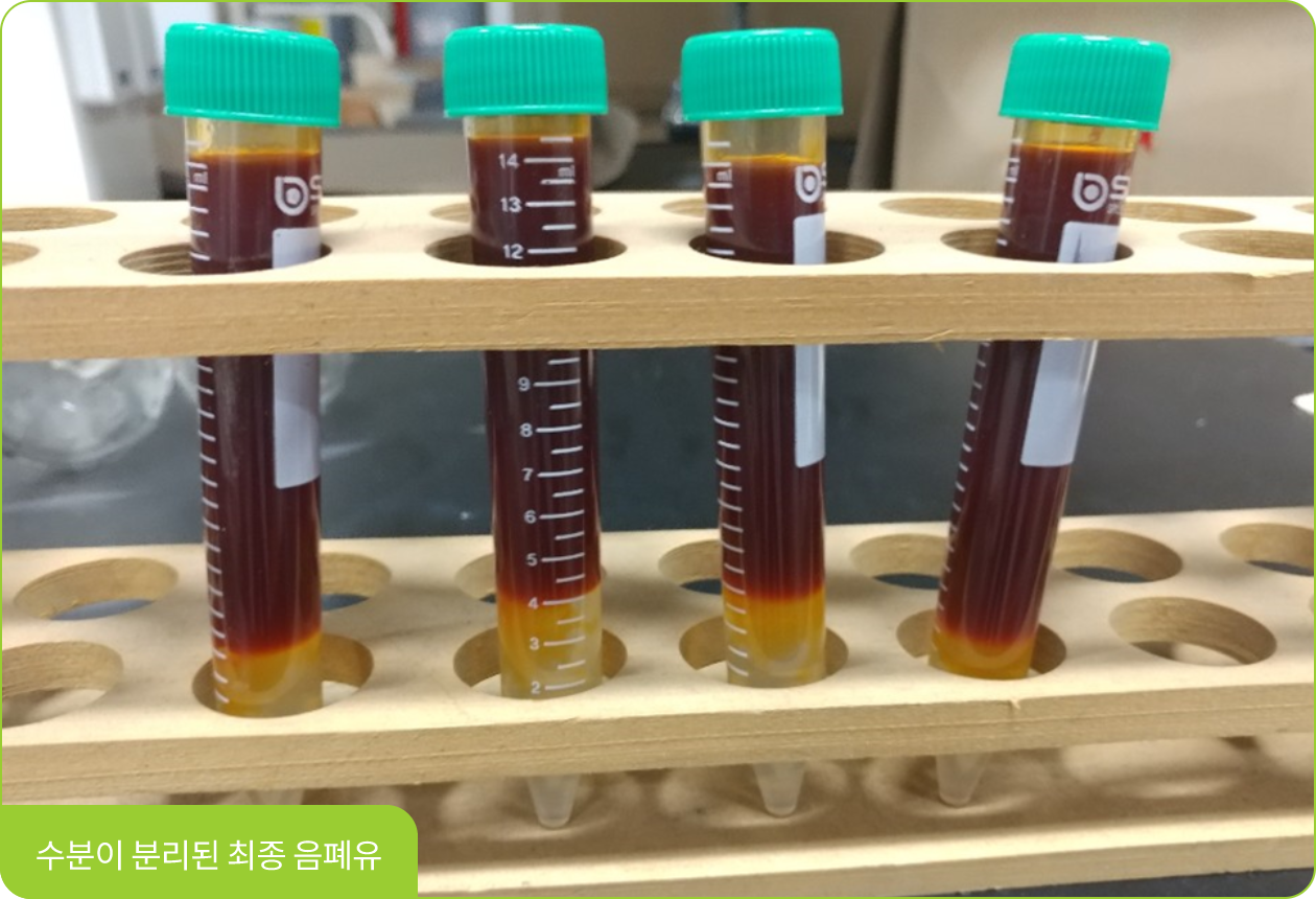 유분분리시설의 정상적 가동성을 확인할 수 있고 최종적으로 음폐유를 저장탱크로 이송합니다. - 당사의 연구소에 비치된 원심분리기를 통해 지자체에서 생산되는 유분의 성능을 분석함으로써 일정 수준의 음폐유 생산이 가능합니다.