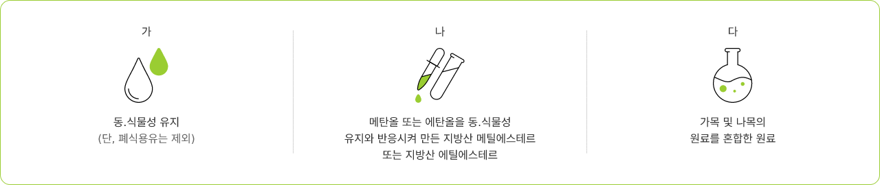 - 환경오염이나 훼손, 자원고갈이 심각한 원유에서 원료를 얻지 않고, 인간의 활동에서 발생한 음식물폐기물인 동식물성 유지, 팜유, 탕유, 폐식용유, 각종 부산물유지를 원료로 하여 여기에 각종 화합물을 혼합하여 얻는 에너지원(황산화물18ppm 이하, 질소산화물 180ppm 이하, 먼지 50 mg/S㎥ 이하) (산업통상자원부 고시 제2019-36호에 따른 품질기준)