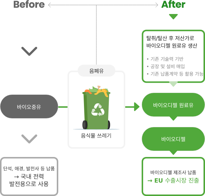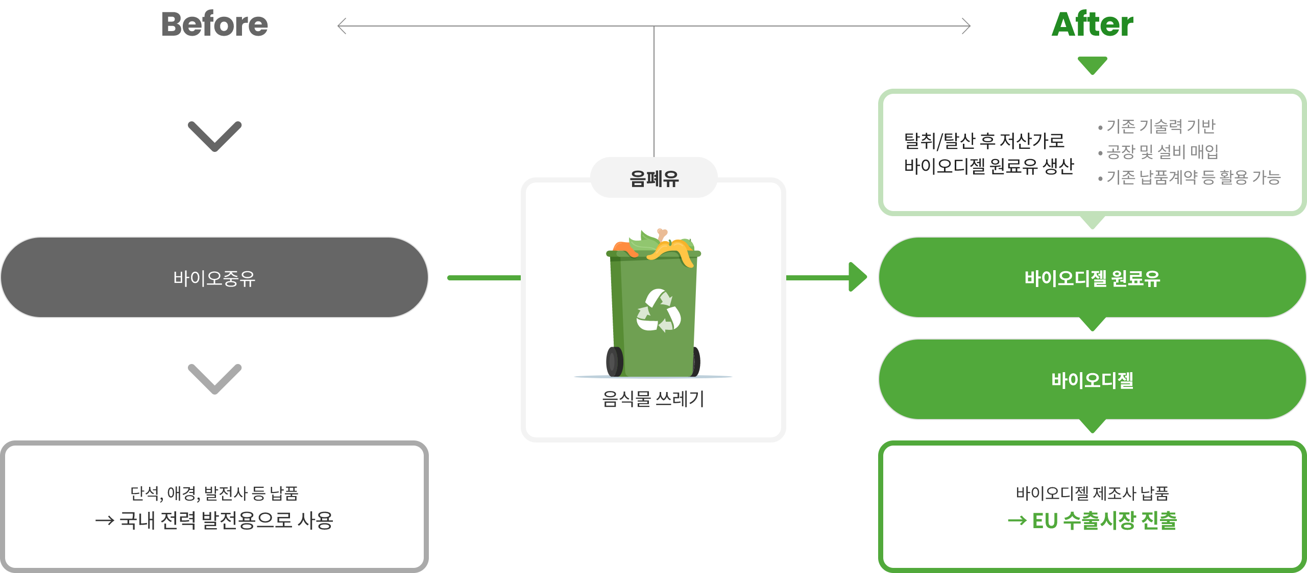 - 자원순환 친환경에너지로서 기존에 가장 많이 사용하는 발전 연료인 벙커C유의 대체재이며, 원료의 국내자급(자급률 향상)이 가능하며, 공급 안정성 확보가 가능하니다.