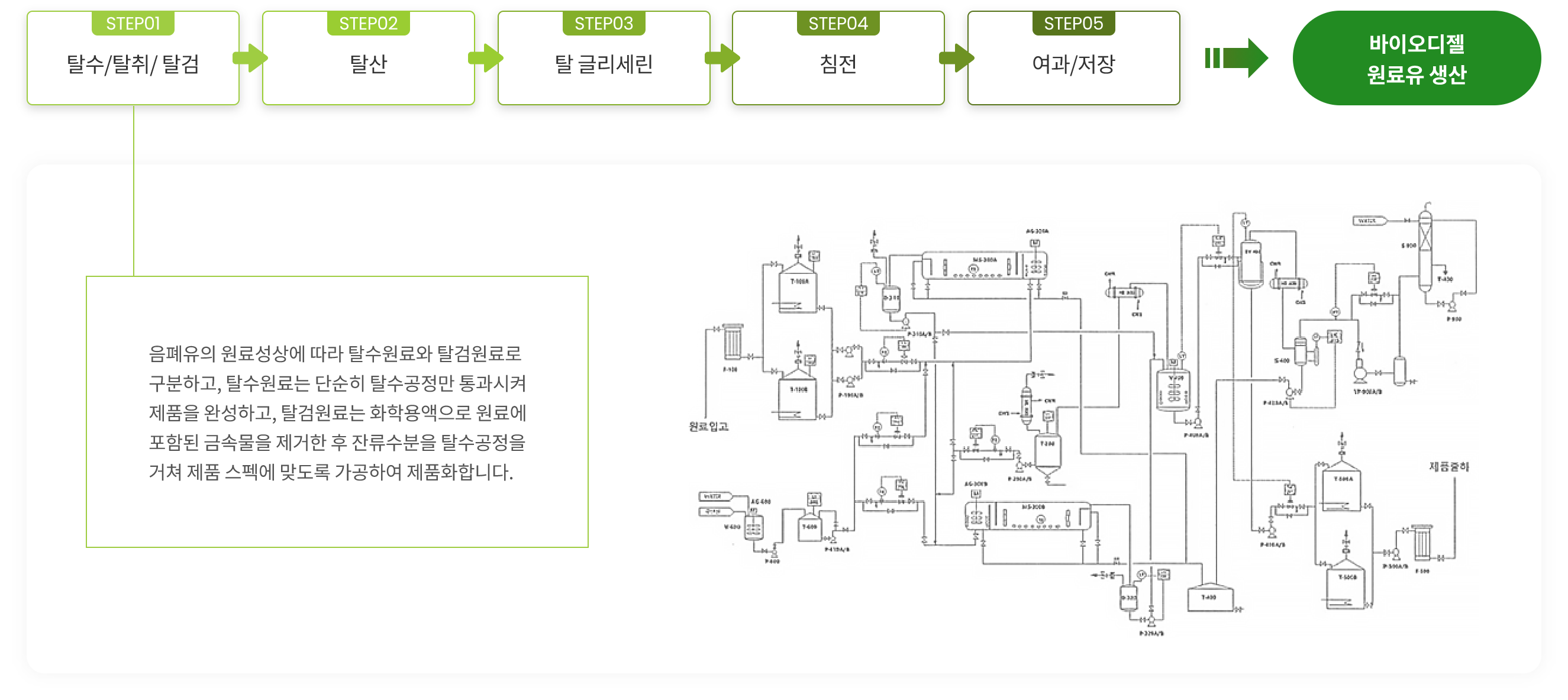 - 탈수,탈취,탈검 공정 : 유지를 탈수, 탈취하는 공정으로서, 반응 조 하단에 Air를 투입하여 110℃ 승온하고 수분 0.05% 이하로 탈수