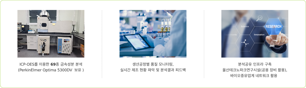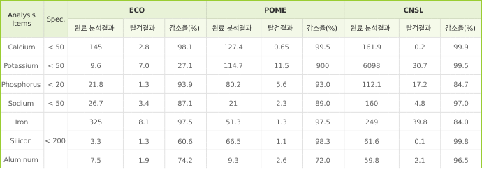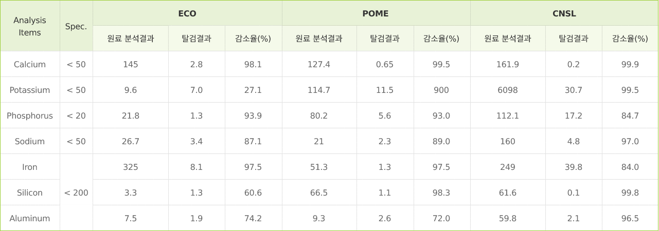 동/식물성 유지의 분석 기술 분야- 동/식물성 유지의 분석 기술 : CNSL 회분 저감 및 산화 안정성 평가, Palm Oil 전처리를 통한 회분 및 금속성분 제거 기술, 음폐유 Mineral 제거 & Oil 내에 악취 제거기술, 고산가 촉매를 이용한 고산가 음폐유의 에스테르화 반응 기술