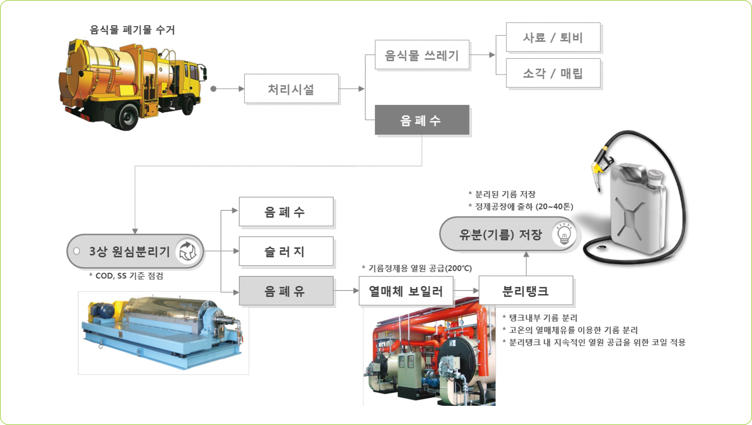 - 음폐수에서 유분의 분리는 3상원심분리기 및 2상 원심분리기(고액분리기)를 활용한 물리적 분리공정이며 폐수 내부의 슬러지를 동시에 제거하기 때문에 음폐수의